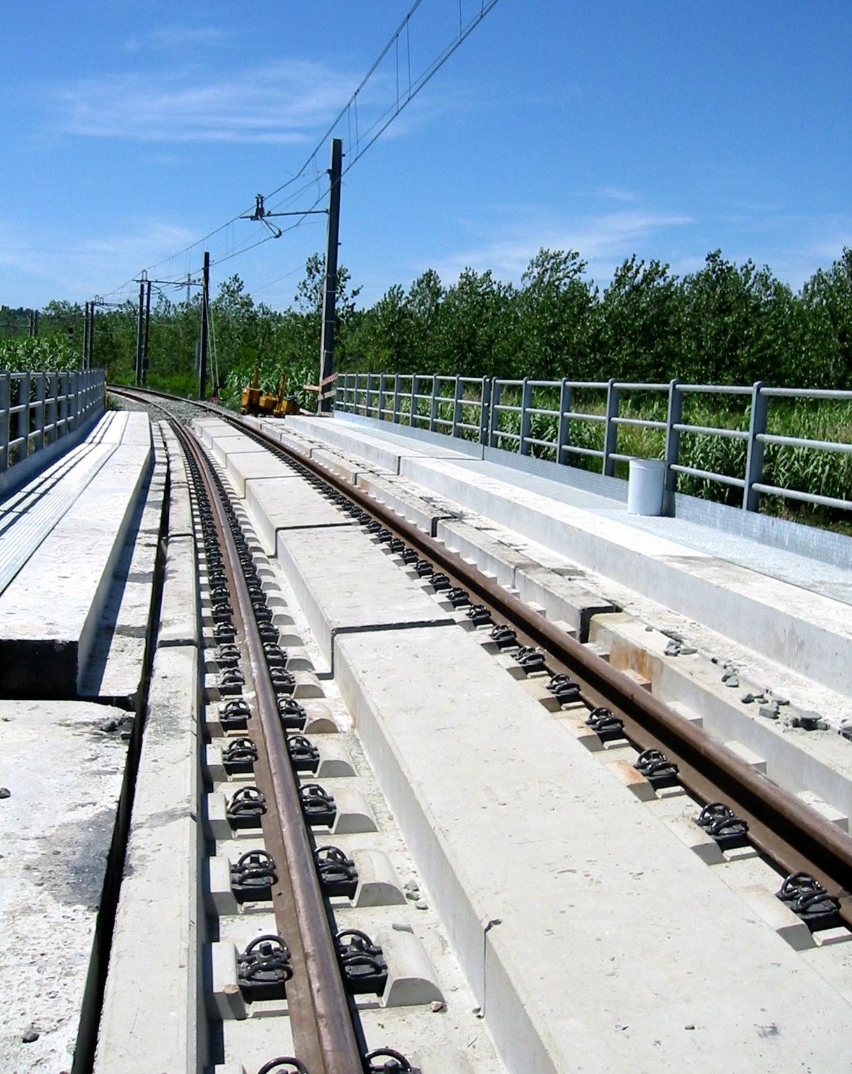 Dans le cas de l’insertion d’un pont dans un tracé avec ballast et traverses, une solution avec des plates-formes préfabriquées en béton armé a été étudiée et réalisée, qui agit comme un tablier porteur pour la sustructure traditionnelle.